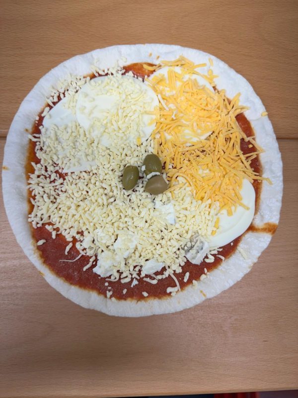Pizza maison composée de sauce tomate, mozzarella, cheddar, roquefort, gruyère râpé et olives