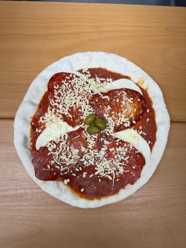 Pizza maison composée de sauce tomate, mozzarella, gruyère râpé, chorizo et olives