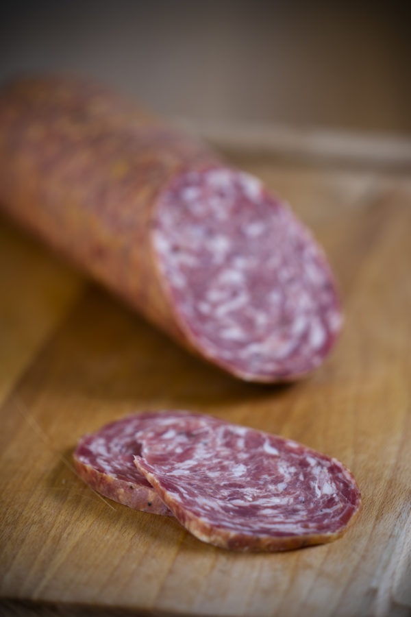 Saucisson porc et bœuf séché et fumé traditionnellement agrémenté de morceaux de jambon salé et miel